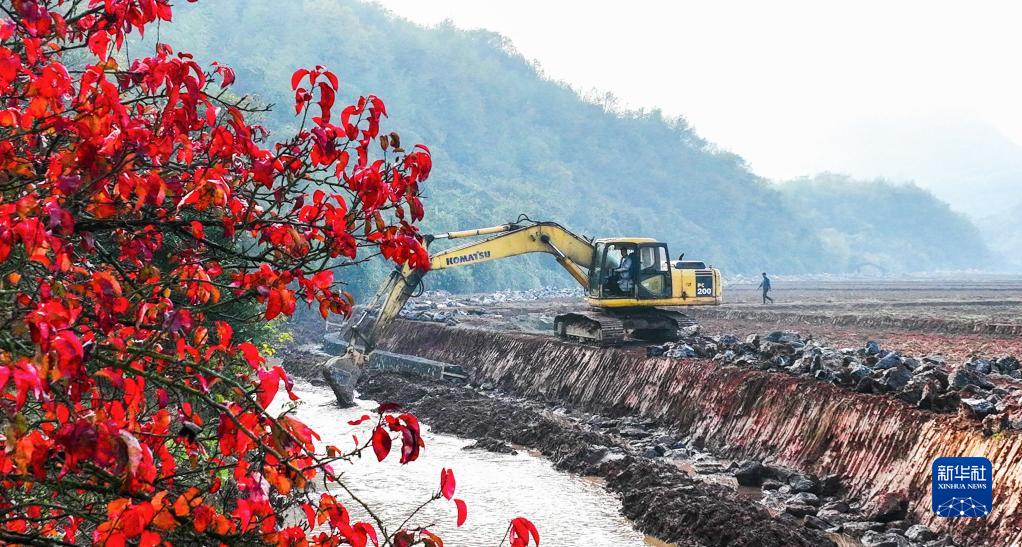 在湖南省衡阳市常宁市兰江乡兰江村,工作人员驾驶作业机械进行高标准农田建设施工(2021年12月21日摄,无人机照片)。