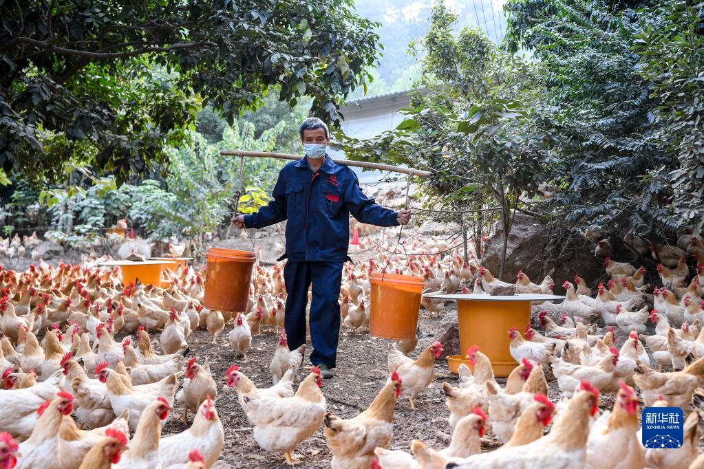 在广西兴业县一处林下三黄鸡养殖基地,村民搬运饲料准备投喂(2021年11月18日摄)。