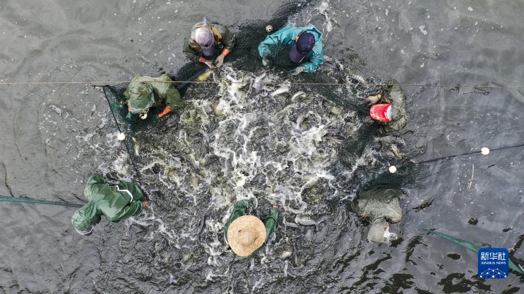 广西钦州市钦南区沙埠镇下虎坝村村民在鱼塘拉网收鱼(2021年11月18日摄,无人机照片)。