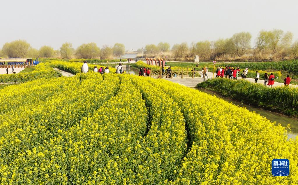3月10日,游客在江苏省高邮市湖上花海景区赏花游览(无人机照片)。