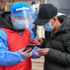 3月10日,在吉林省长春市朝阳区红旗街道一核酸检测点,工作人员帮助居民进行网上登记。
