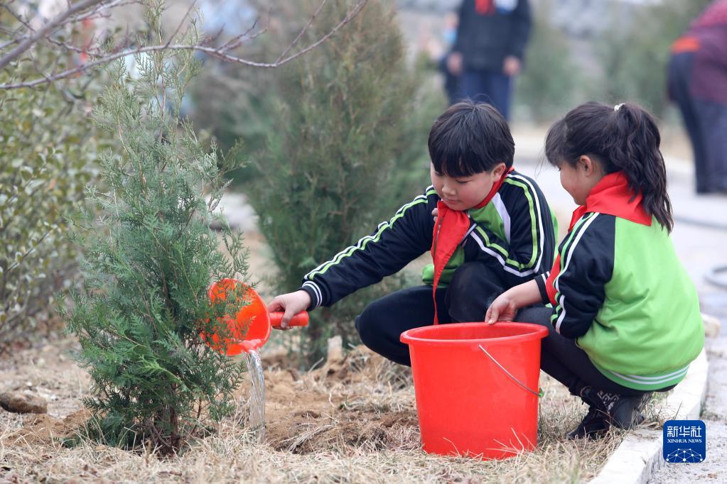 3月11日,在河北省石家庄市行唐县口头镇鲁家峪村,参加义务植树活动的学生为树苗浇水。