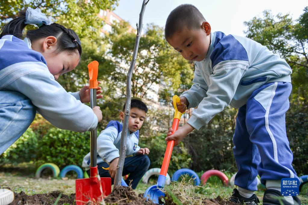 3月11日,江苏南京建邺区金地名京幼儿园的小朋友在栽植小树苗。