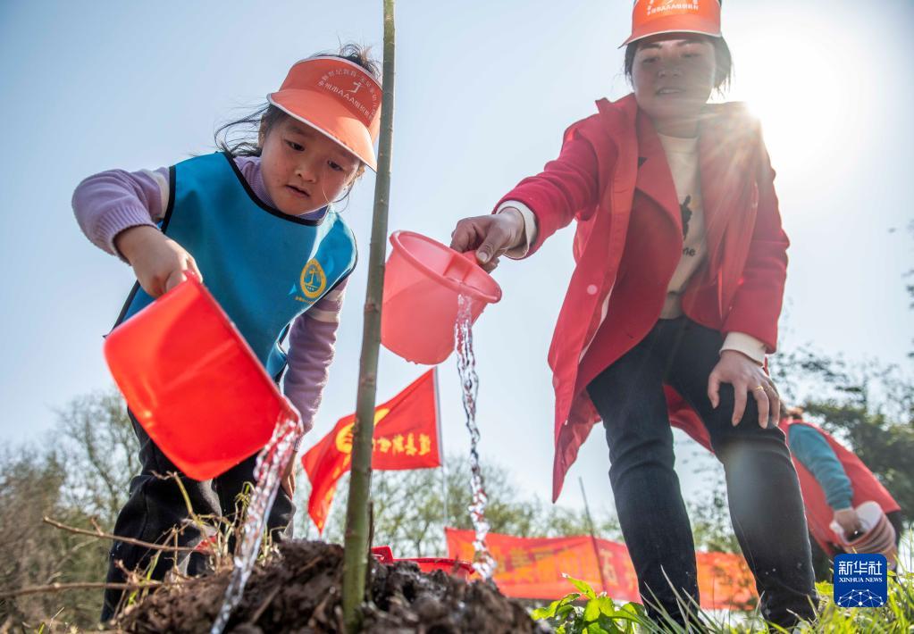 3月10日,在湖南省永州市道县上关街道中山石村,小朋友和家长在义务植树活动中为树苗浇水。