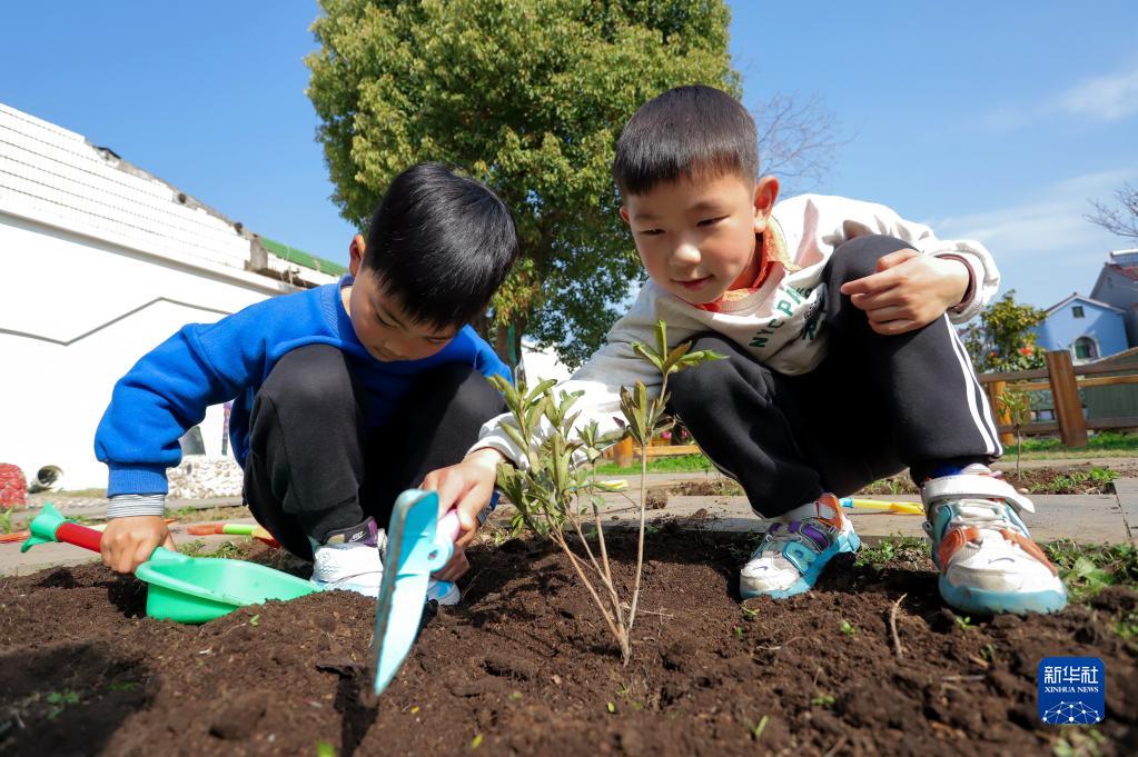 3月11日,浙江省湖州市长兴县李家巷镇中心幼儿园的小朋友在栽植小苗。