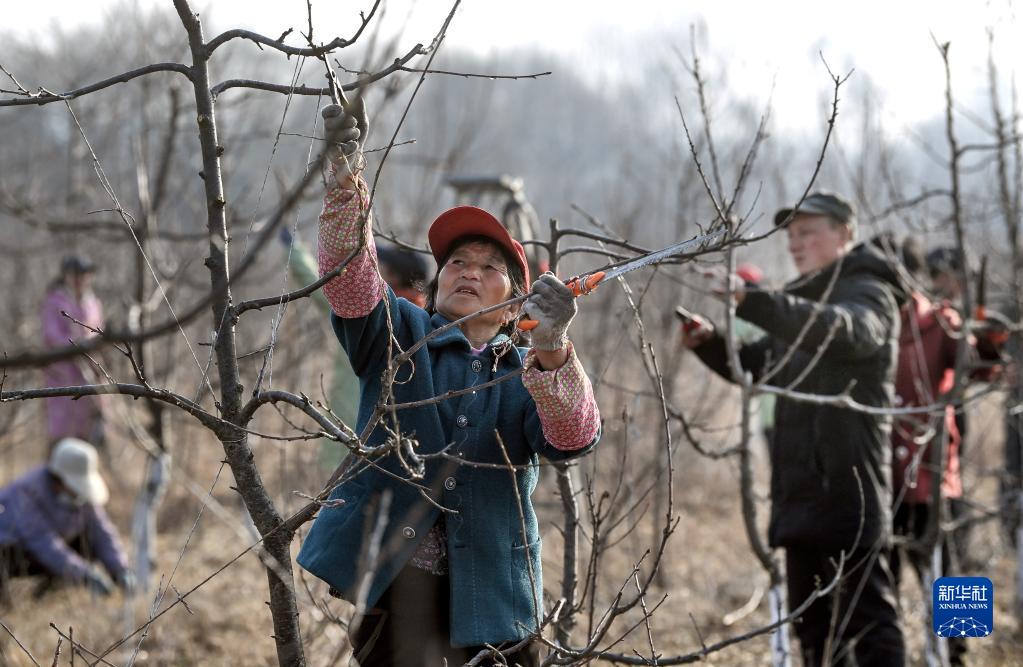 3月11日,技术员在陕西省洛南县古城镇千亩大樱桃产业园为樱桃树整枝。