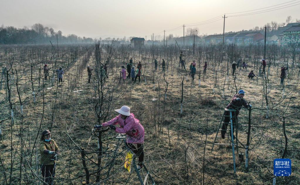 3月11日,技术员在陕西省洛南县古城镇千亩大樱桃产业园为樱桃树整枝(无人机照片)。