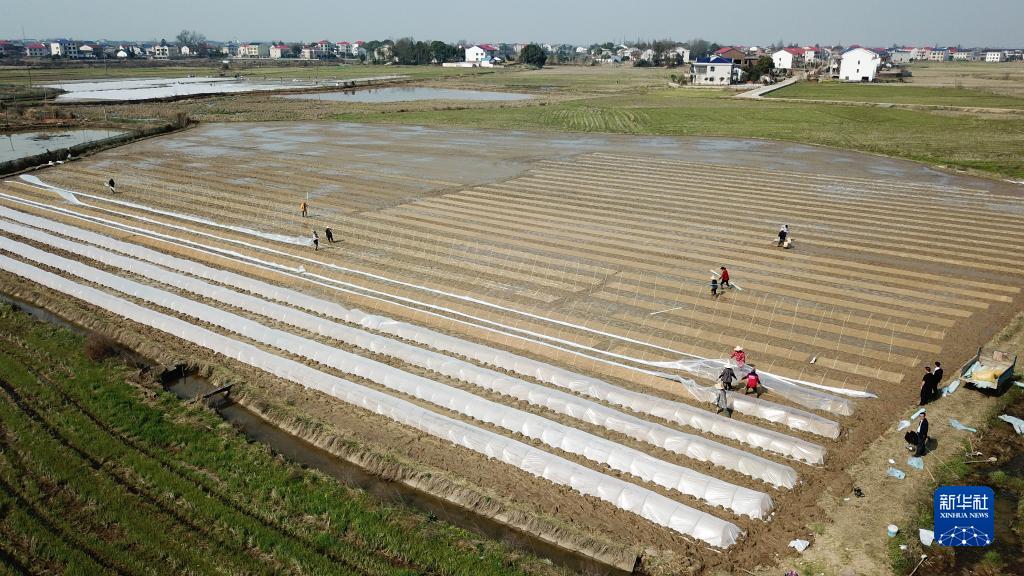 3月11日,在湖南省汨罗市屈子祠镇,农民在田间忙碌(无人机照片)。
