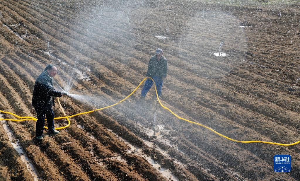 3月11日,陕西省洛南县古城镇南村村民为红仁核桃园套种中药材的田园地浇水(无人机照片)。