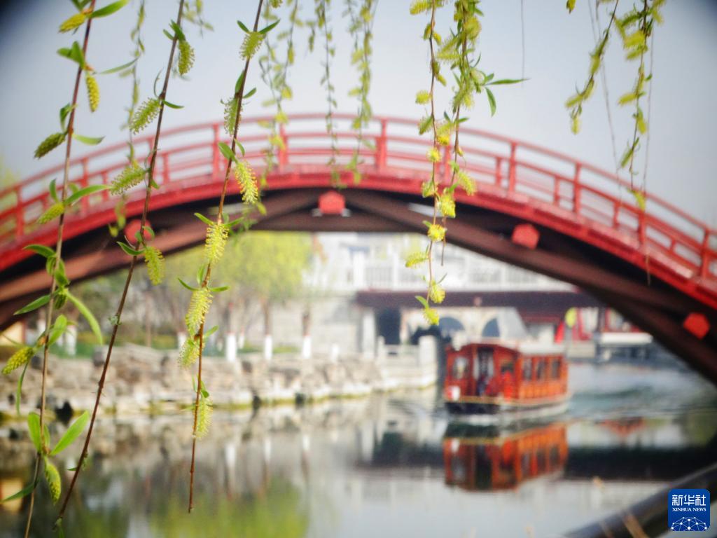3月11日,游客乘船在河南省开封市大宋御河游览观光。