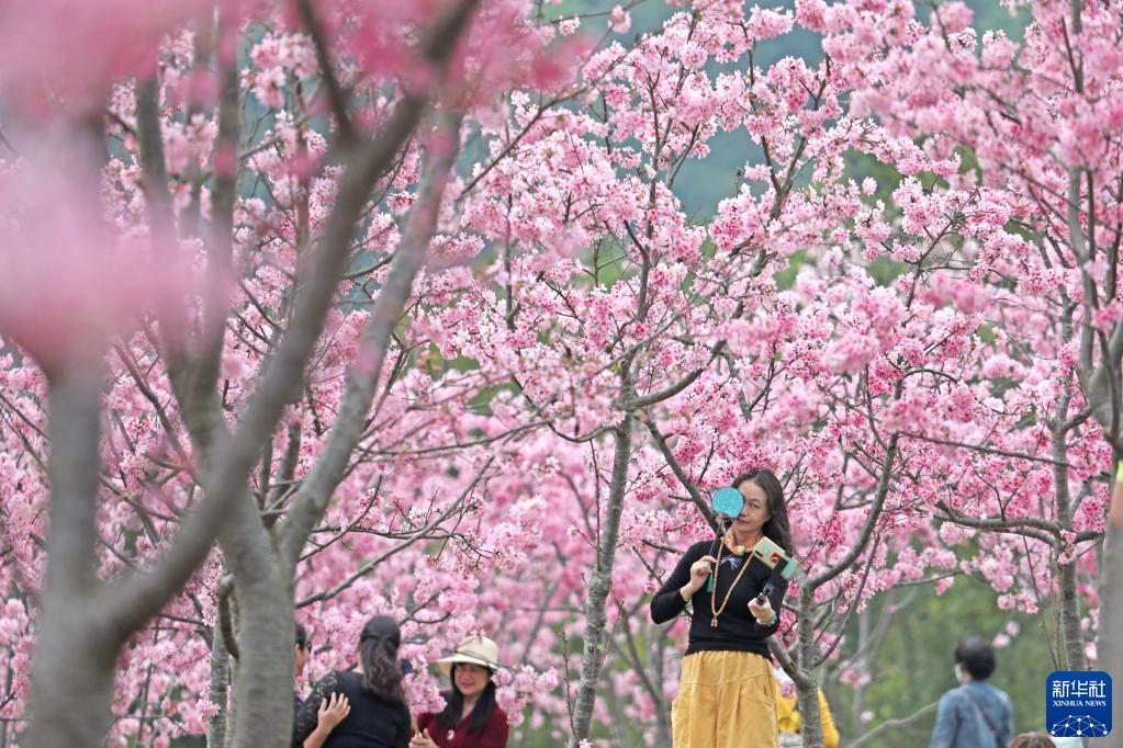 3月11日,游客在广西南宁市青秀山风景区观赏樱花、拍照留念。