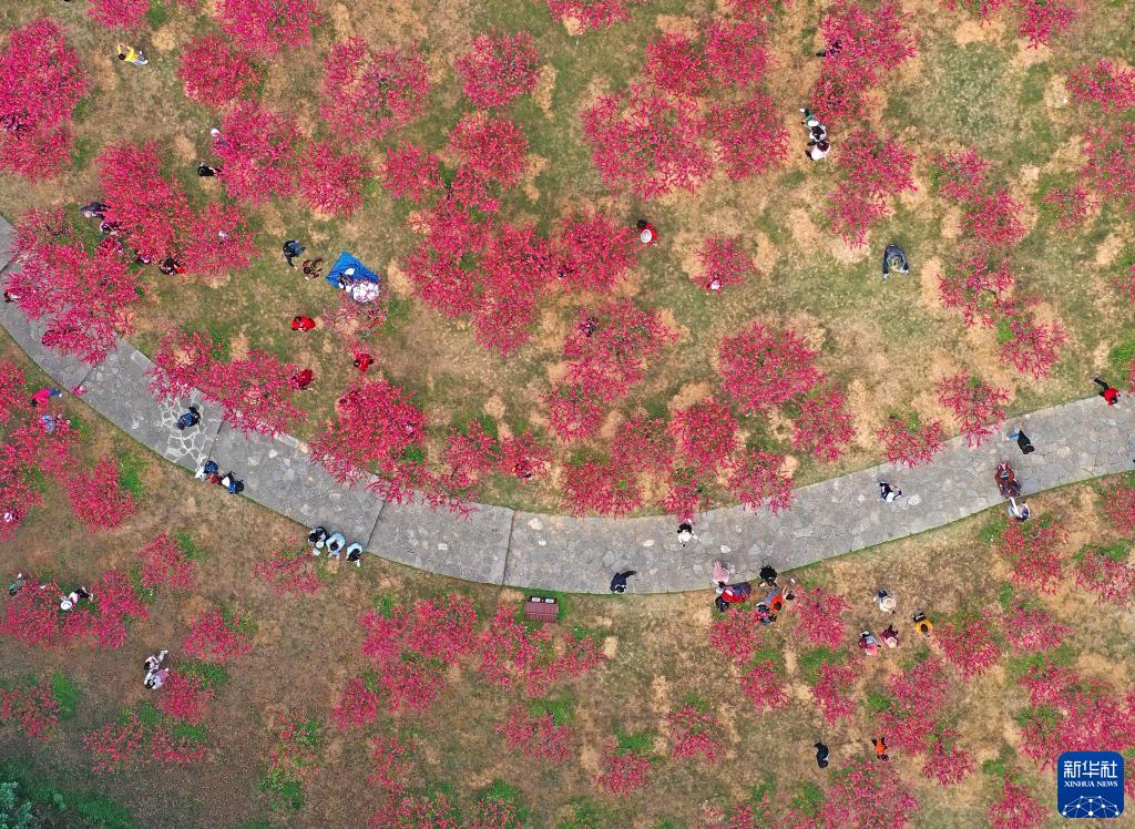 游客在广西南宁市青秀山风景区观赏桃花(3月11日摄,无人机照片)。