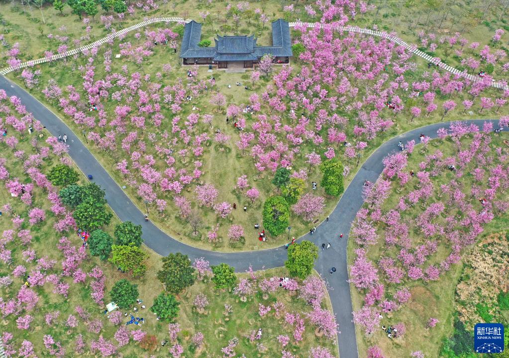 游客在广西南宁市青秀山风景区观赏樱花(3月11日摄,无人机照片)。