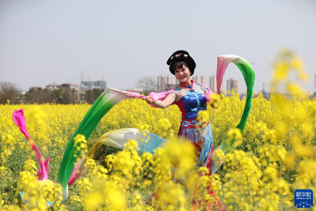 3月11日,戏曲爱好者在湖南省衡阳市衡阳县西渡镇的油菜田间练习“水袖”。