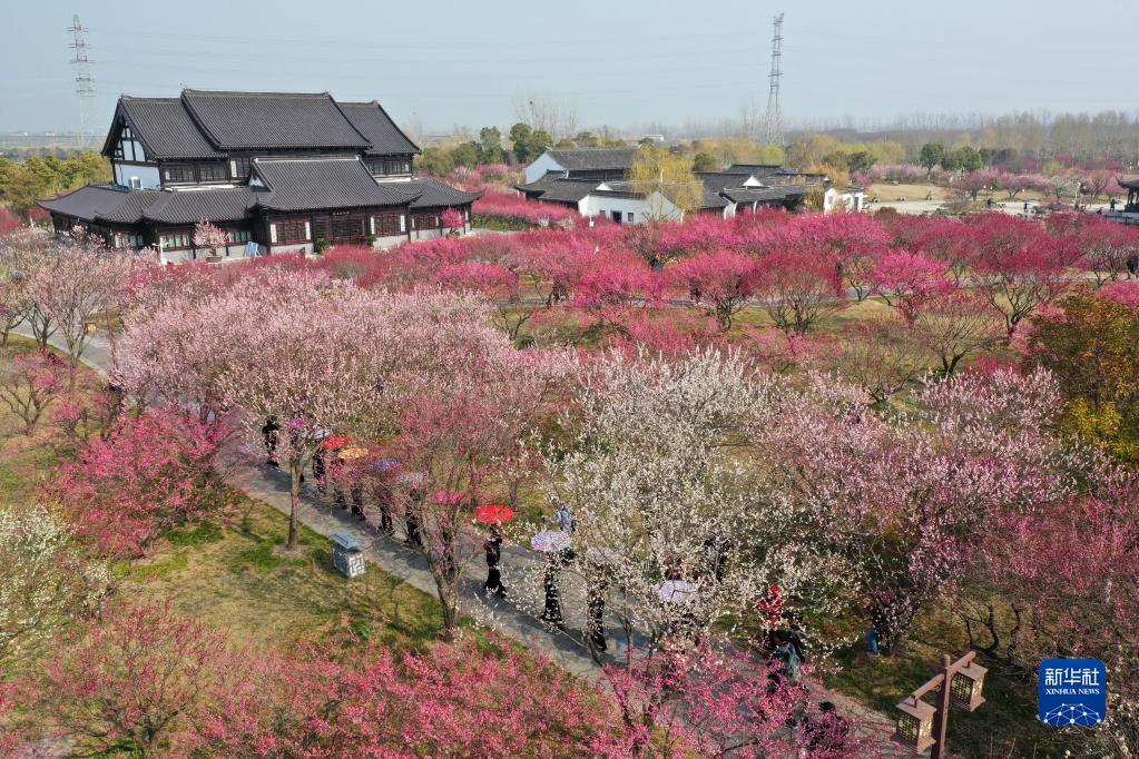 3月11日,在江苏省盐城市大丰梅花湾景区,当地老年旗袍队队员穿行在盛开的梅花间(无人机照片)。