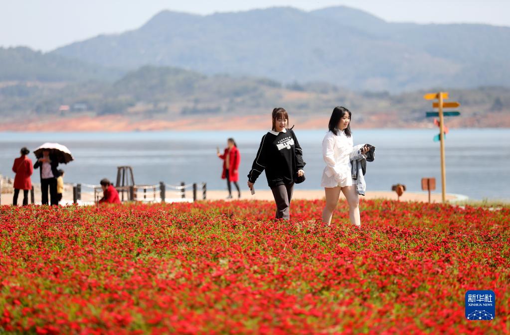 3月10日,游客在湖南省资兴市白廊镇“四季花海”中踏青赏花。