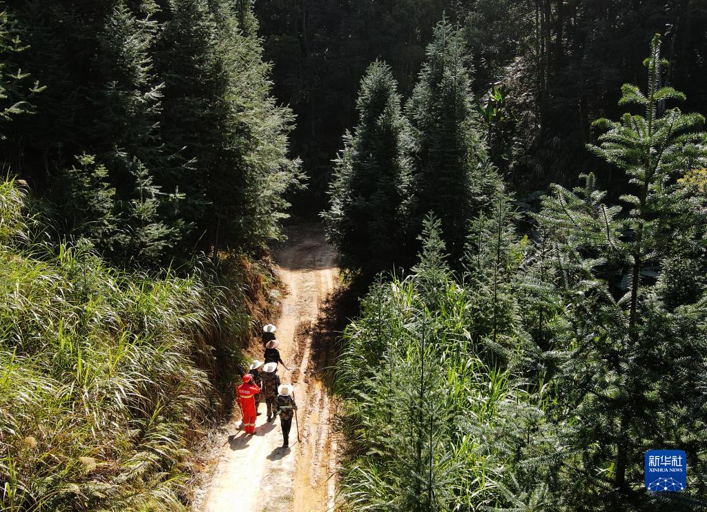3月11日,在安溪丰田国有林场,护林员们带着装备进山巡查(无人机照片)。新华社记者 魏培全 摄