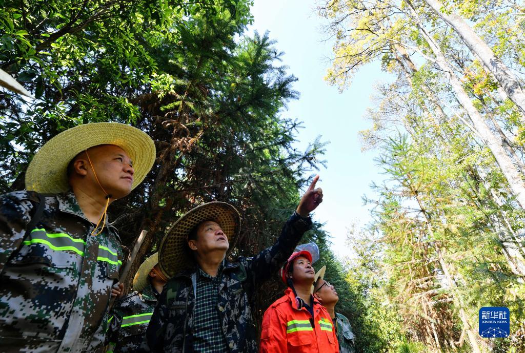 3月11日,黄秋水(左二)和护林员同事一起巡山,查看树林的生长情况。新华社记者 魏培全 摄