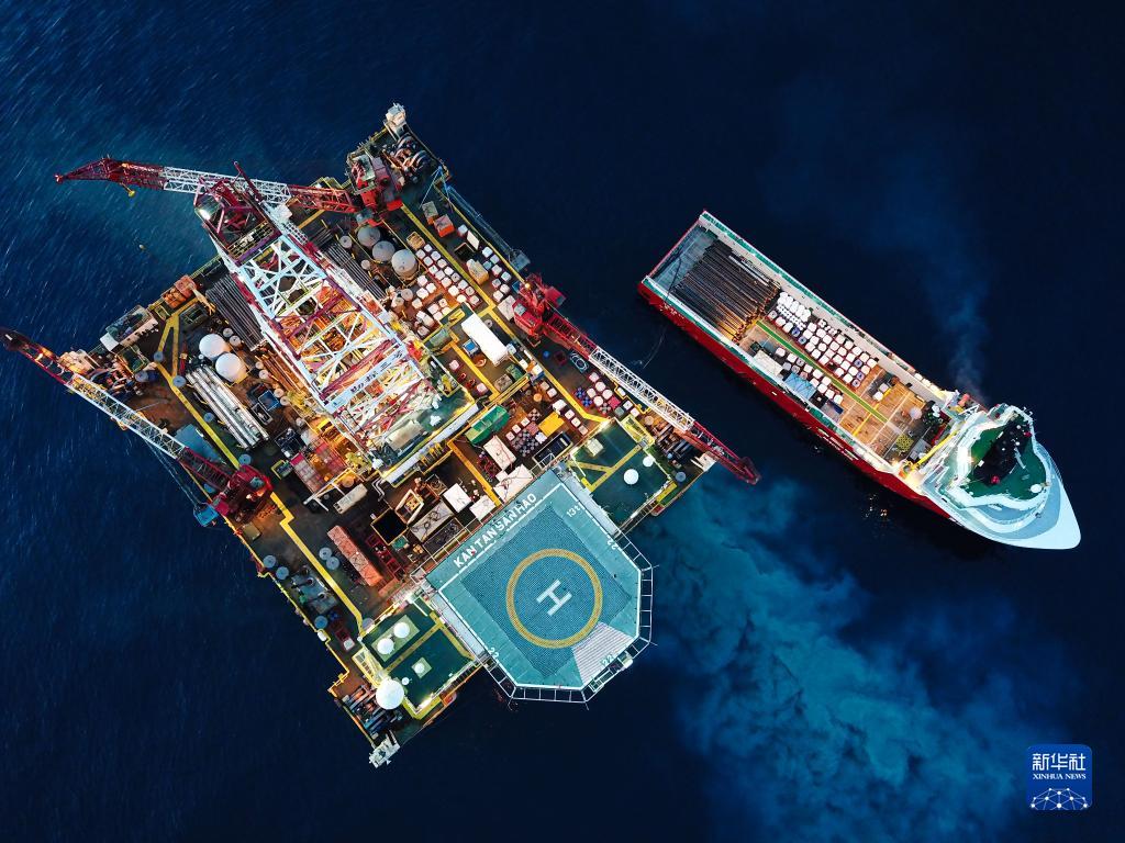 这是2020年7月29日拍摄的正在南海北部海域进行钻探作业的勘探三号钻井平台和为其运送物资的拖船(无人机照片)。新华社记者 蒲晓旭 摄