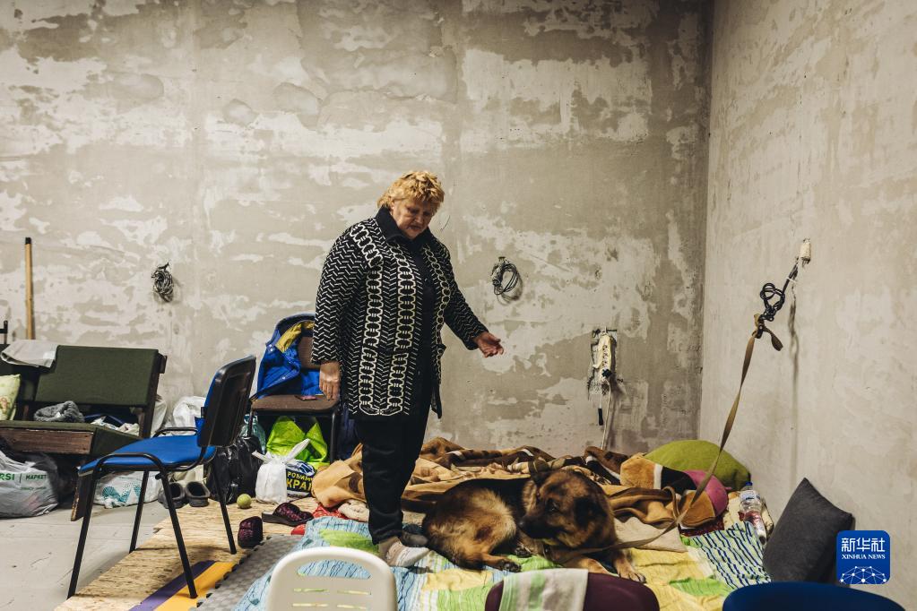 这是3月11日在乌克兰基辅一处安置点的地下室内拍摄的一名女子和她的狗。