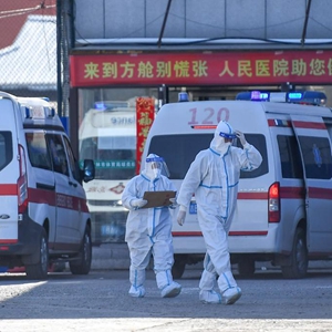 3月11日,工作人员在吉林市昌邑区方舱医院门外。
