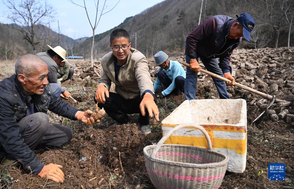 3月12日,王新富(中)在天麻田间与村民一起采挖,并传授天麻人工种植技术。