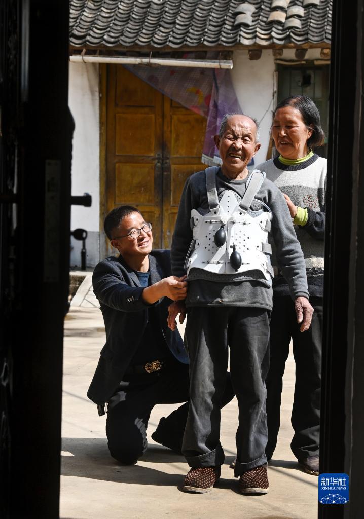 3月12日,王新富(左)为岳父佩戴胸腰背支具。