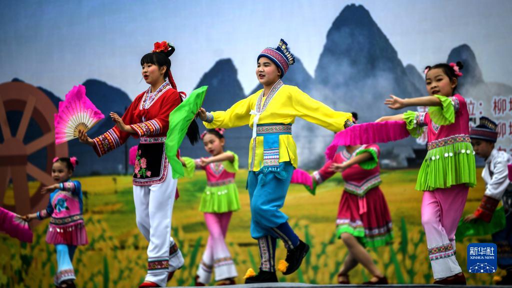 3月11日,广西柳城县一所学校小学生在“乡风文明”服务队成员指导下排练戏曲曲目。