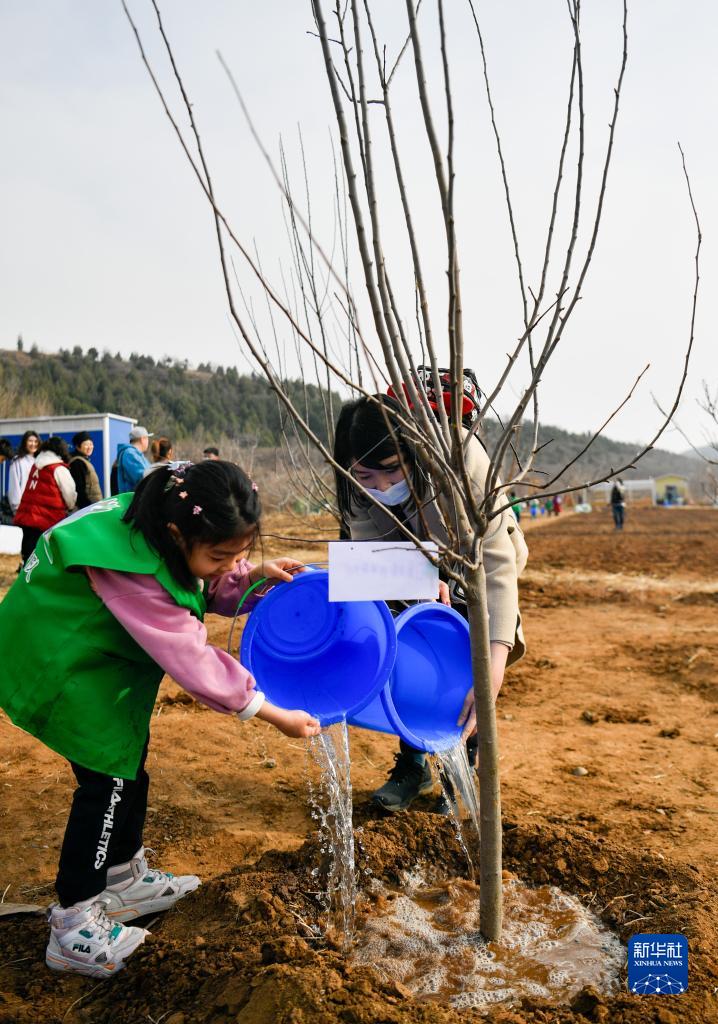 3月12日,在天津市蓟州区春山里永续农场,小朋友与家长为树苗浇水。