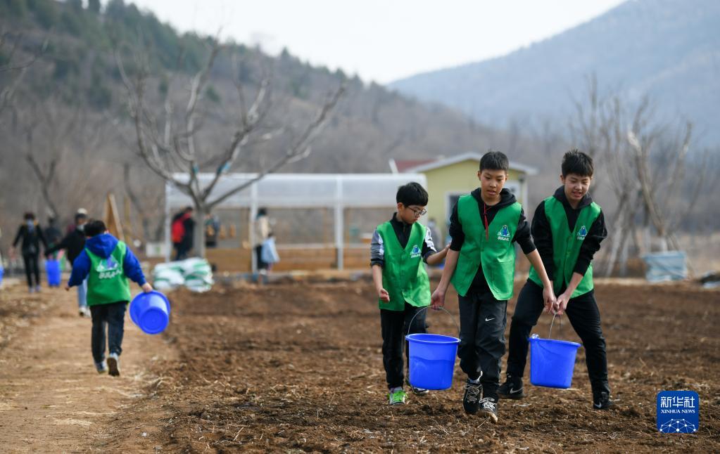 3月12日,孩子们提水准备为树苗浇水。