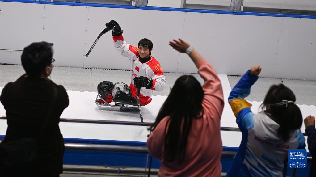 当日,在北京国家体育馆举行的北京2022冬残奥会残奥冰球铜牌赛中,中国队以4比0战胜韩国队获得铜牌。新华社记者 邬惠我 摄