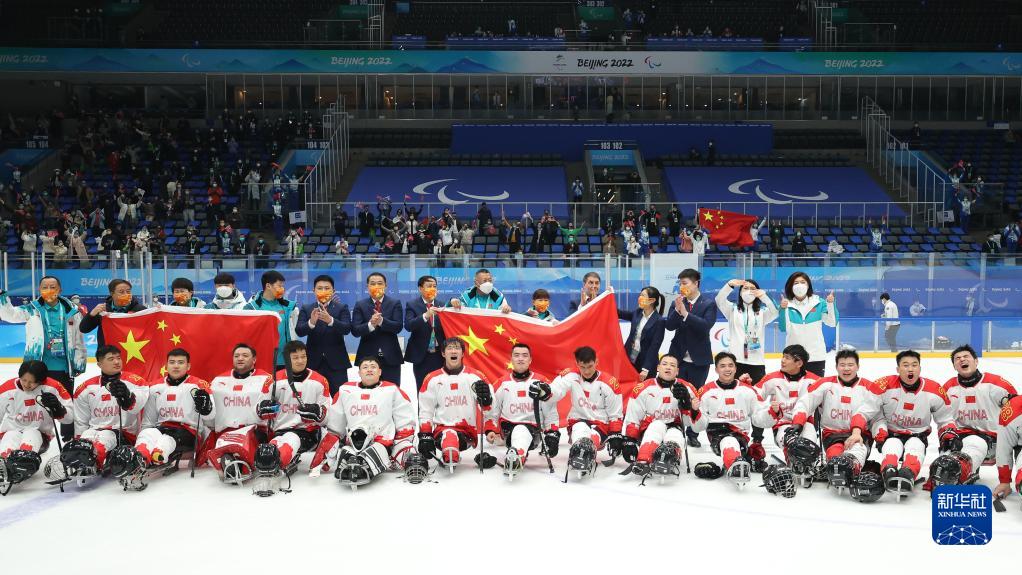 3月12日,中国残奥冰球队在赛后合影庆祝。