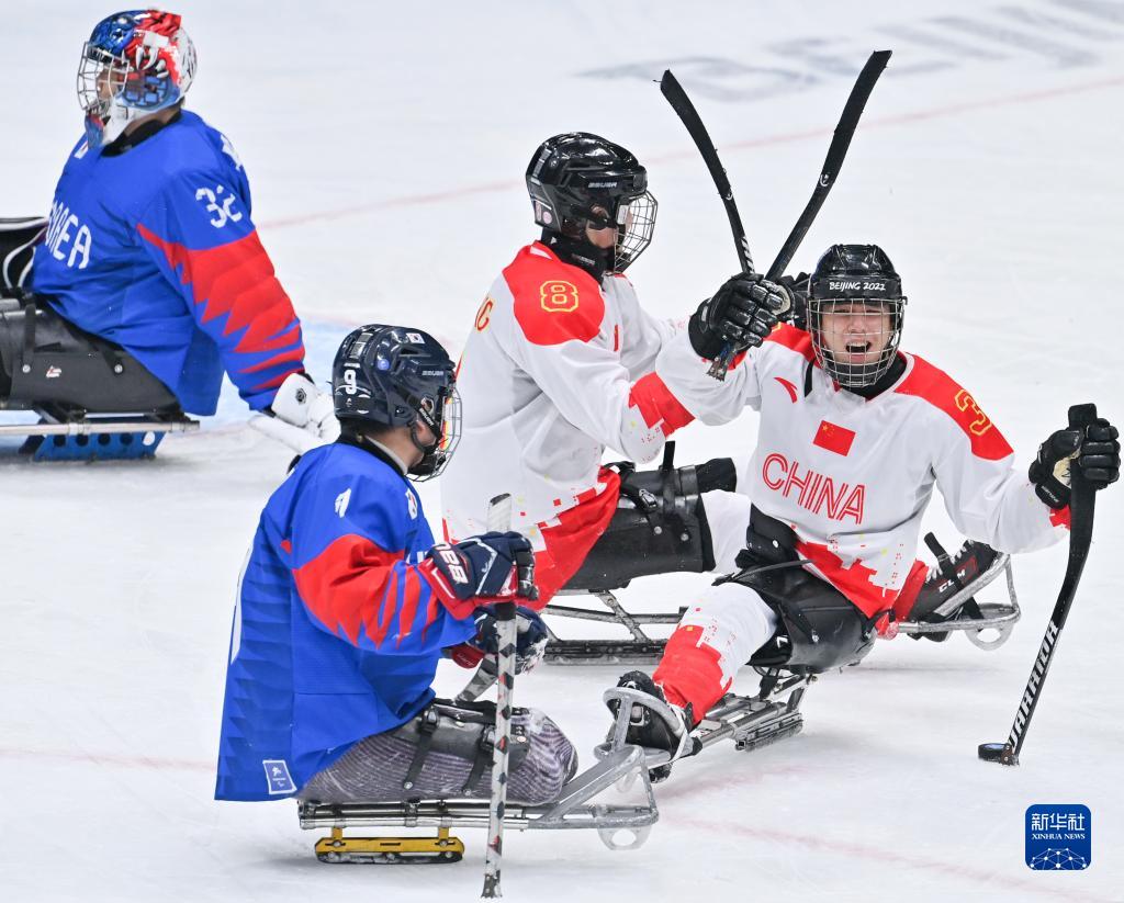 当日,在北京国家体育馆举行的北京2022冬残奥会残奥冰球铜牌赛中,中国队以4比0战胜韩国队获得铜牌。新华社记者 邬惠我 摄