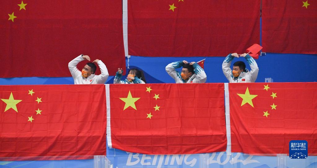 3月12日,北京2022冬残奥会轮椅冰壶冠军中国队选手王海涛、闫卓、陈建新、张明亮(从左至右)在现场为中国队加油。