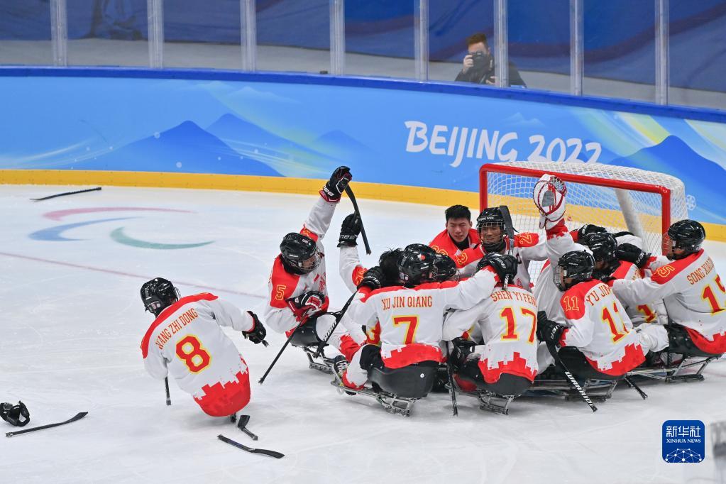 当日,在北京国家体育馆举行的北京2022冬残奥会残奥冰球铜牌赛中,中国队以4比0战胜韩国队获得铜牌。新华社记者 邬惠我 摄