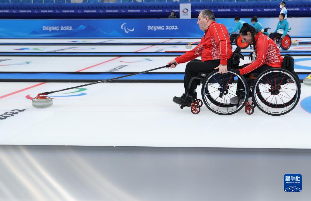 斯洛伐克队选手莫妮卡·孔克洛娃(右)在轮椅冰壶半决赛中协助队友杜尚·皮托纳克稳定轮椅(3月11日摄)。新华社记者 杜潇逸 摄