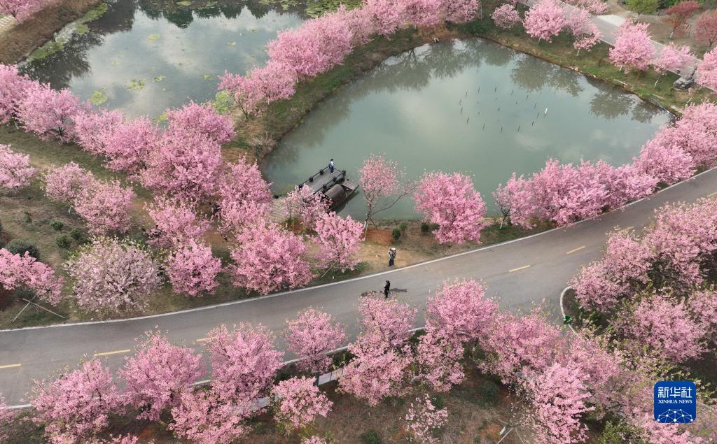 3月12日拍摄的常宁市罗桥镇樱花园里的樱花(无人机照片)。
