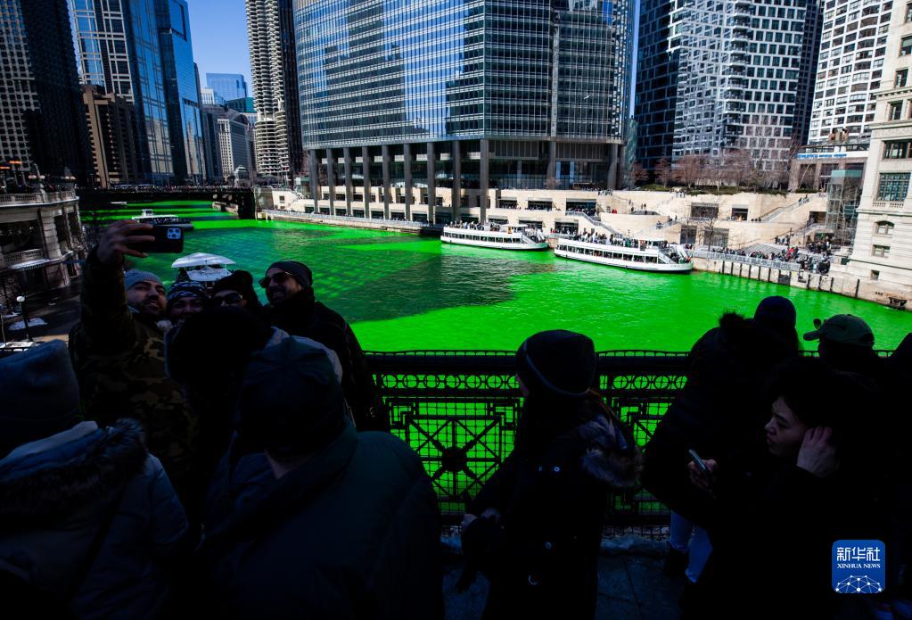 当日,芝加哥市染绿芝加哥河水庆祝3月17日的圣帕特里克节。