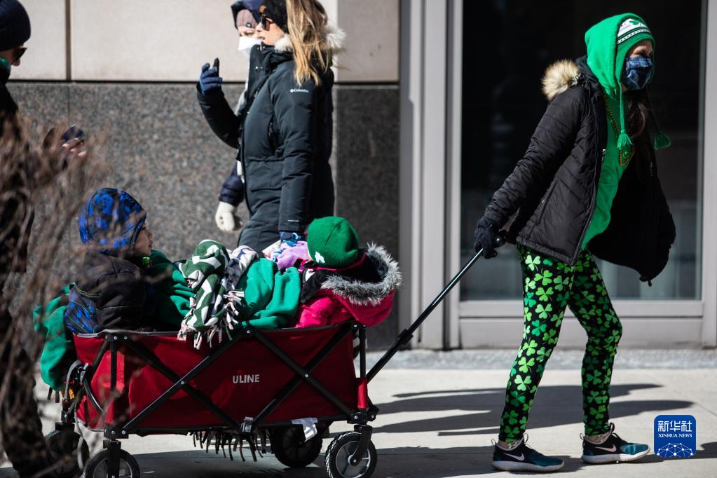 3月12日,在美国芝加哥,一名女子身着绿装参加圣帕特里克节庆祝活动。