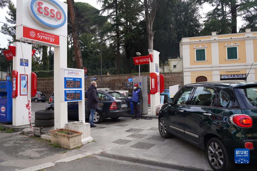 3月12日,人们在意大利罗马一处加油站为车辆加油。