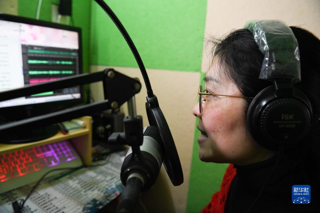 3月12日,马琼在家中录制有声小说。
