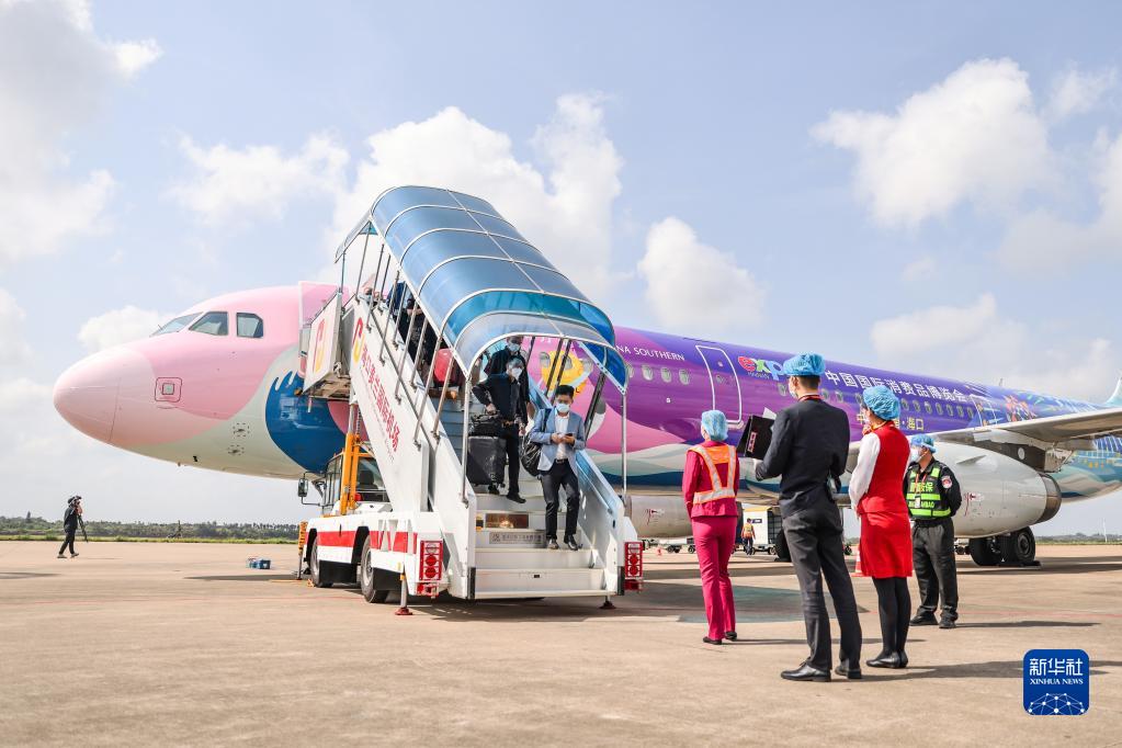 当日,第二届中国国际消费品博览会迎来倒计时30天,从广州出发的中国南方航空消博会主题彩绘飞机“消博号”抵达海口完成首航。