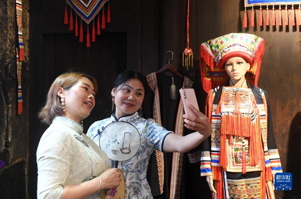 在广西贺州市富川瑶族自治县朝东镇秀水村,两名游客在参观民族服饰展示馆时自拍(3月12日摄)。