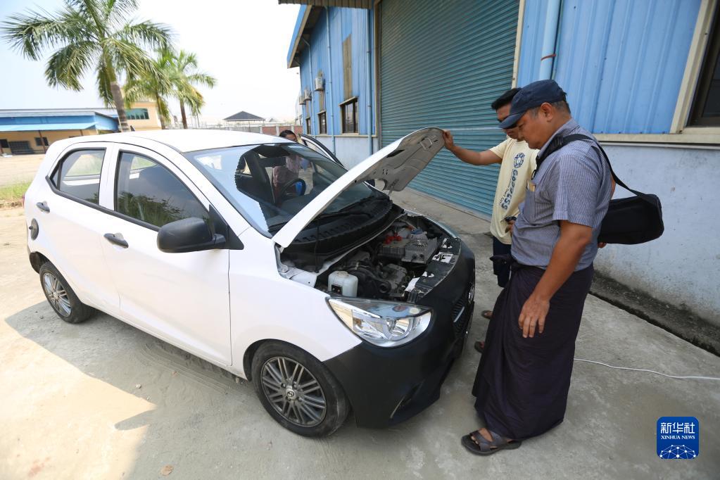 3月9日,在缅甸仰光,顾客在凯凯桑达汽车制造有限公司咨询新能源汽车的情况。