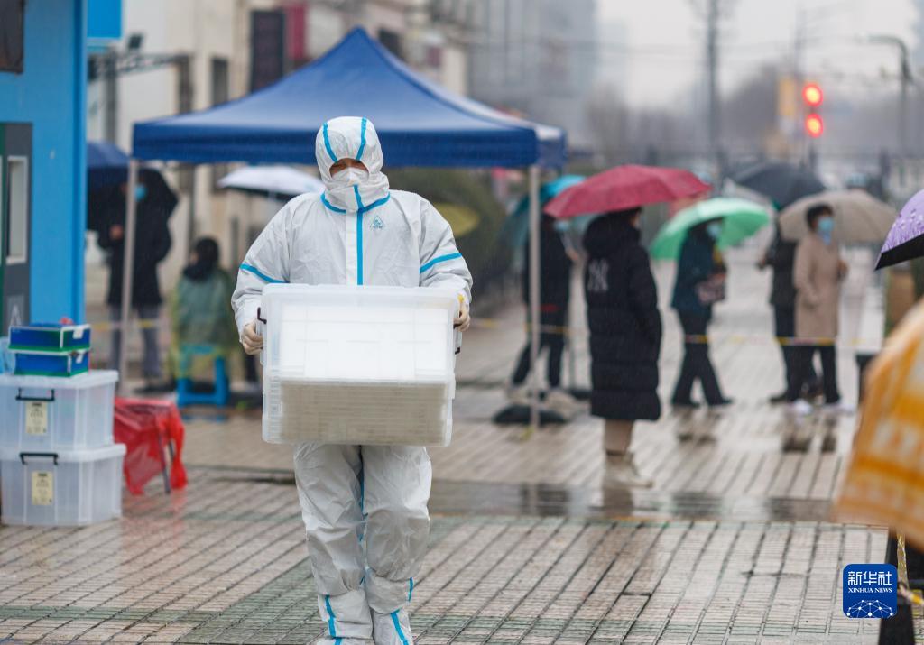3月12日,在天津市南开区华苑街道日华里社区,工作人员在雨中搬运物资。