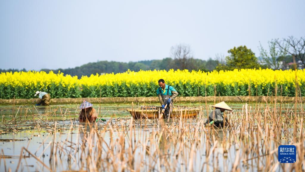 天气回暖,湖南省衡阳市常宁市板桥镇板桥村莲藕种植基地的浅水藕迎来丰收,当地藕农抓紧有利时机采收莲藕,供应市场,田间一派忙碌景象。