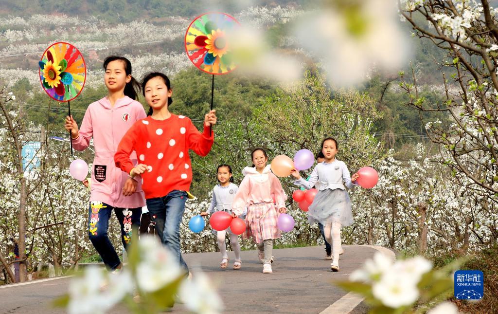 3月13日,小朋友在四川省眉山市仁寿县曹家镇东联村梨园里游玩。