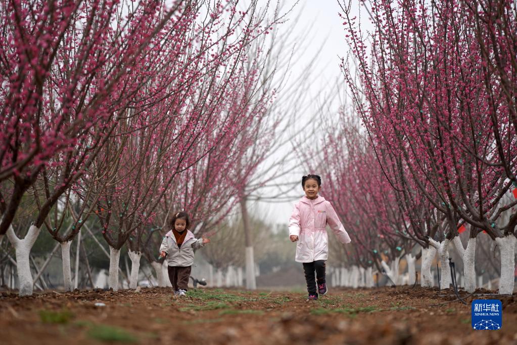3月13日,小朋友在河北省柏乡县王家庄乡杨村的柏旭梅园里游玩。