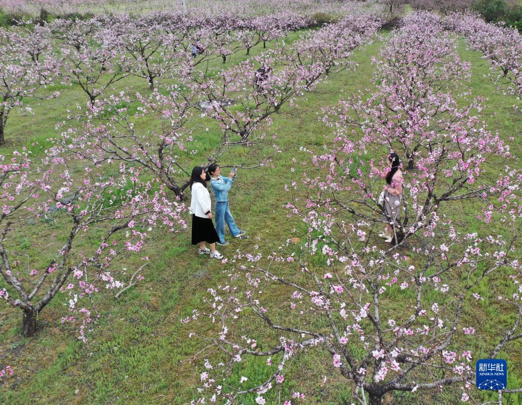 3月13日,在湖南省永州市道县大坪铺农场,游客在欣赏桃花(无人机照片)。