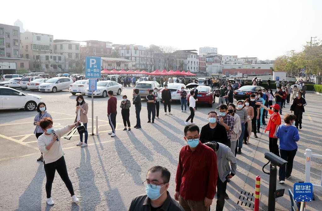 3月13日,泉州市丰泽区志愿者引导市民有序排队接受核酸检测。